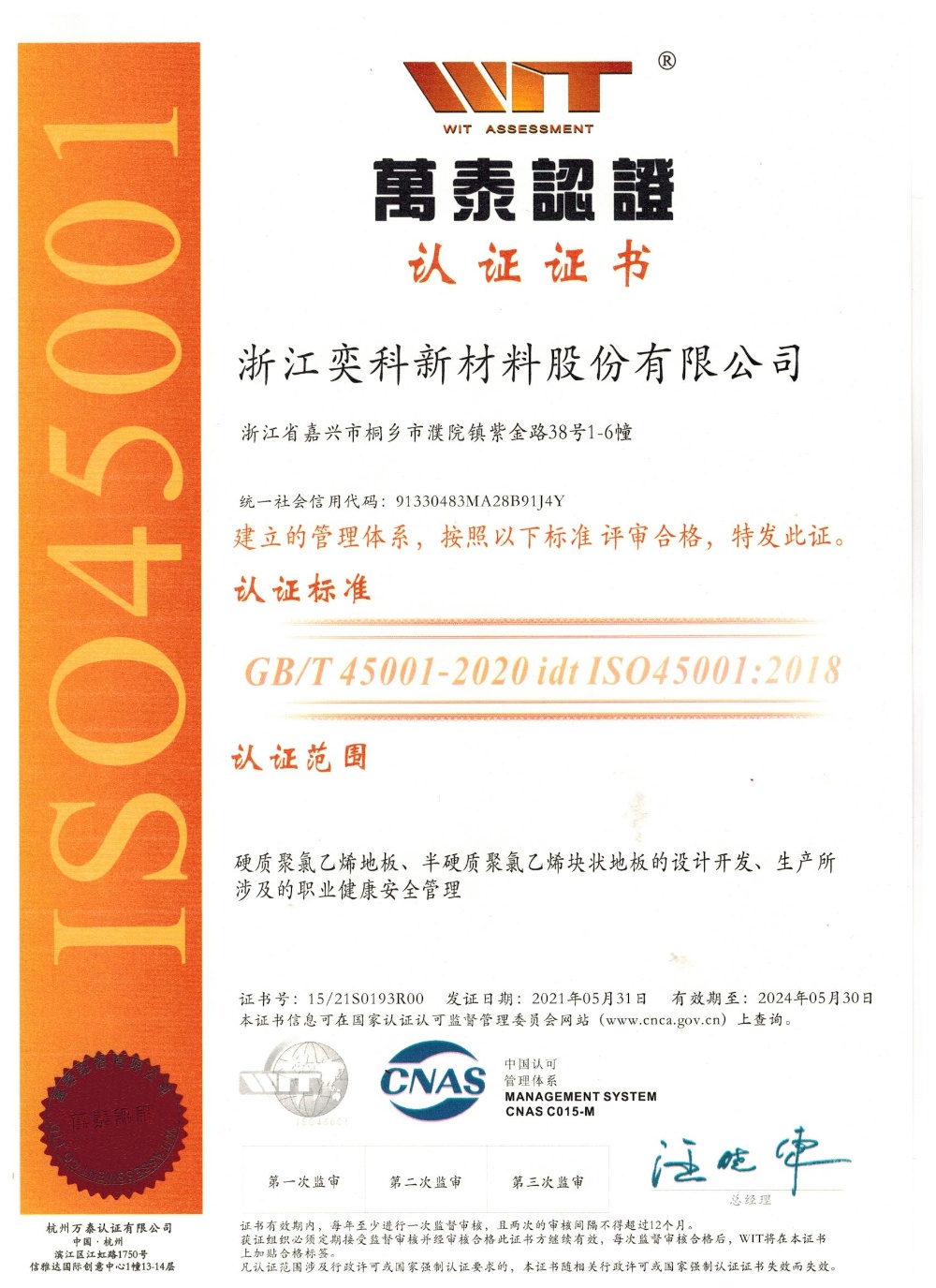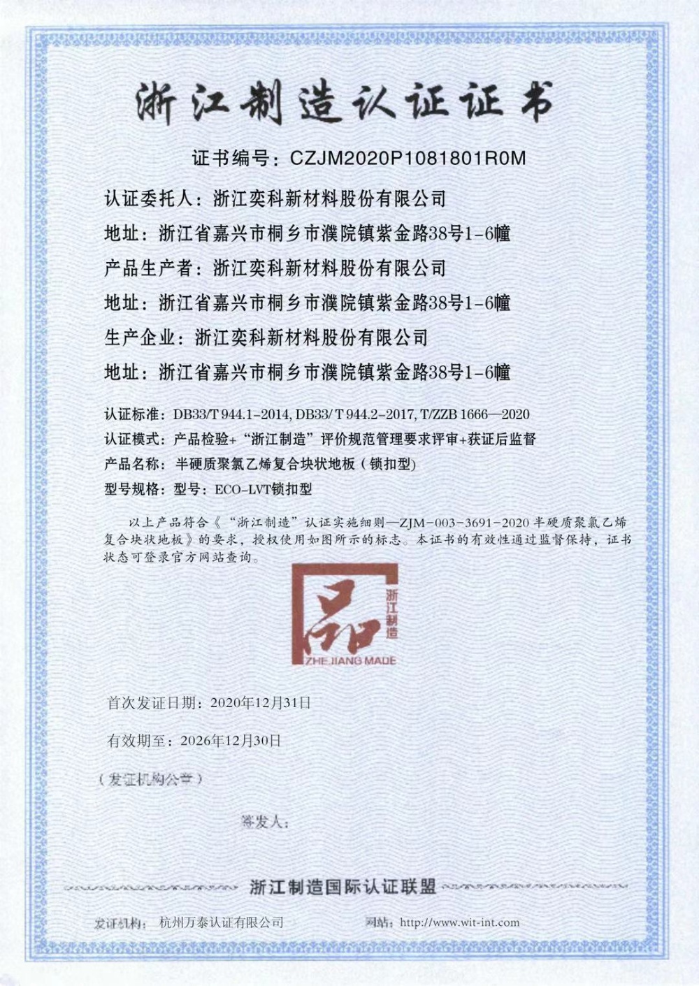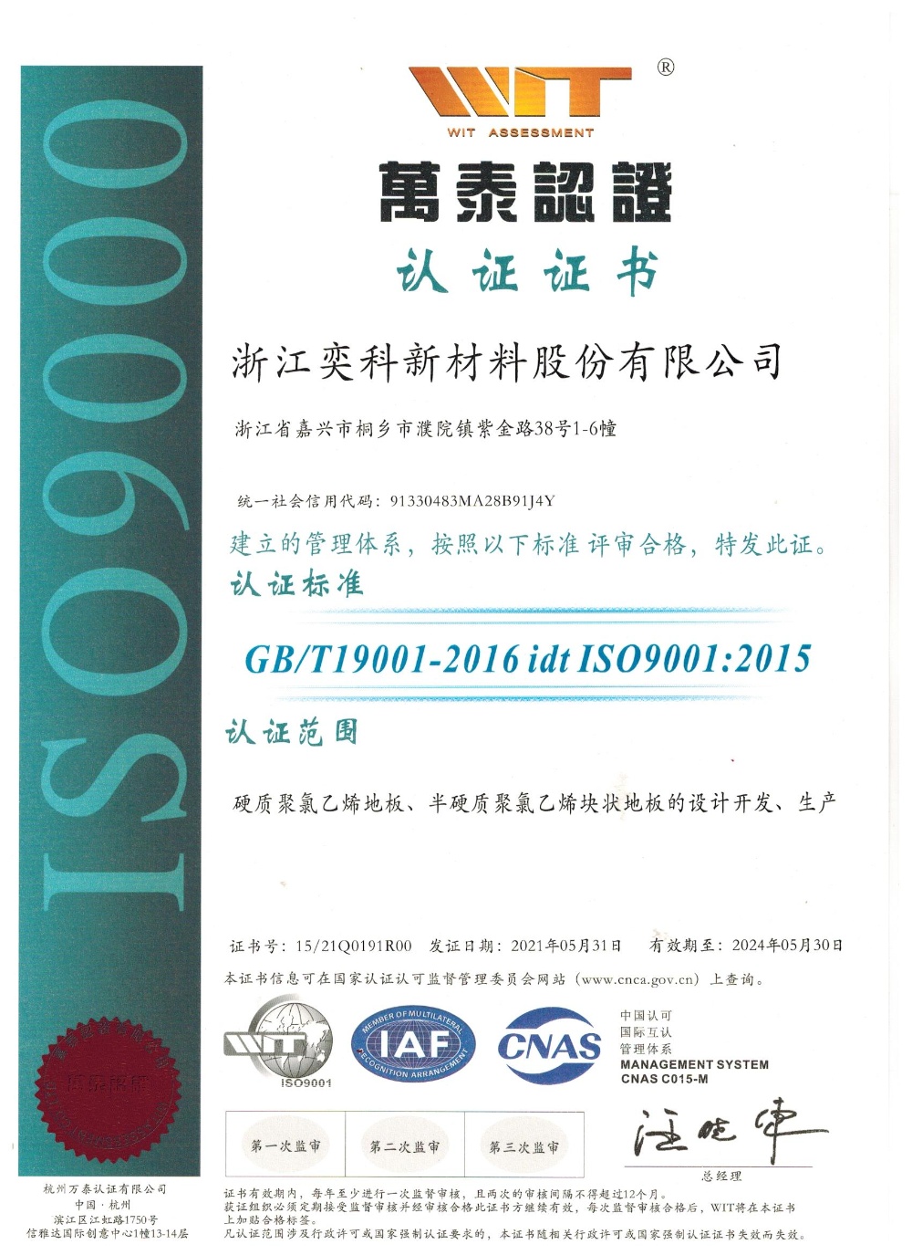 浙江奕科新材料股份有限公司座落于中國羊毛衫名鎮(zhèn)"濮院鎮(zhèn)",地處滬、杭、蘇金三角地帶,地理位置十分優(yōu)越。成立于2017年,注冊資金一億一千八百八十萬元。公司專注于新型石晶環(huán)保地板的研發(fā)、生產(chǎn)與銷售,擁有實用新型專利及發(fā)明專利近四十余項,通過了國標、美標、歐標等各種檢測和認證。